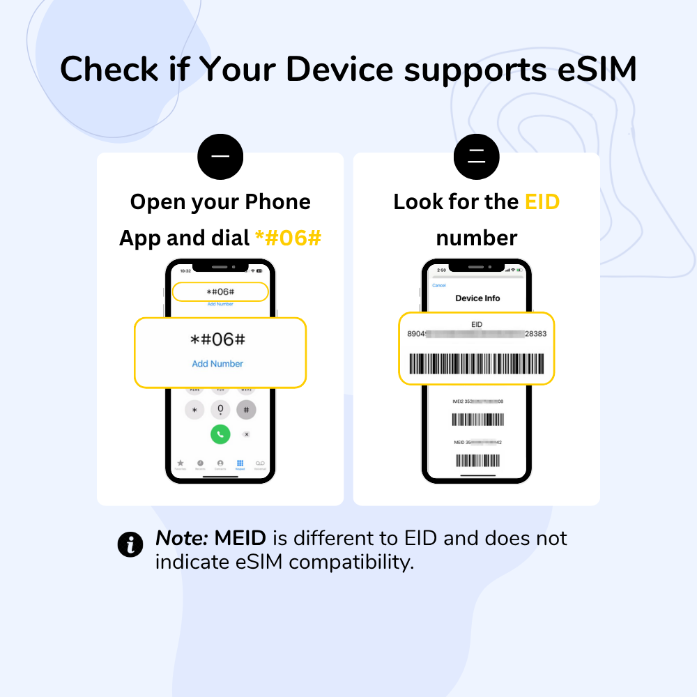 - Dial *#06# — if you see a 32-digit EID, your device supports eSIM.